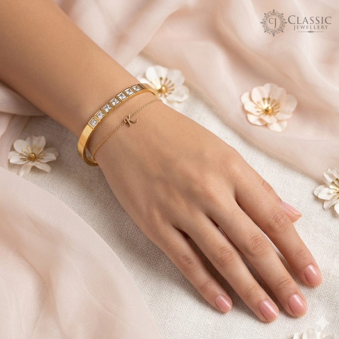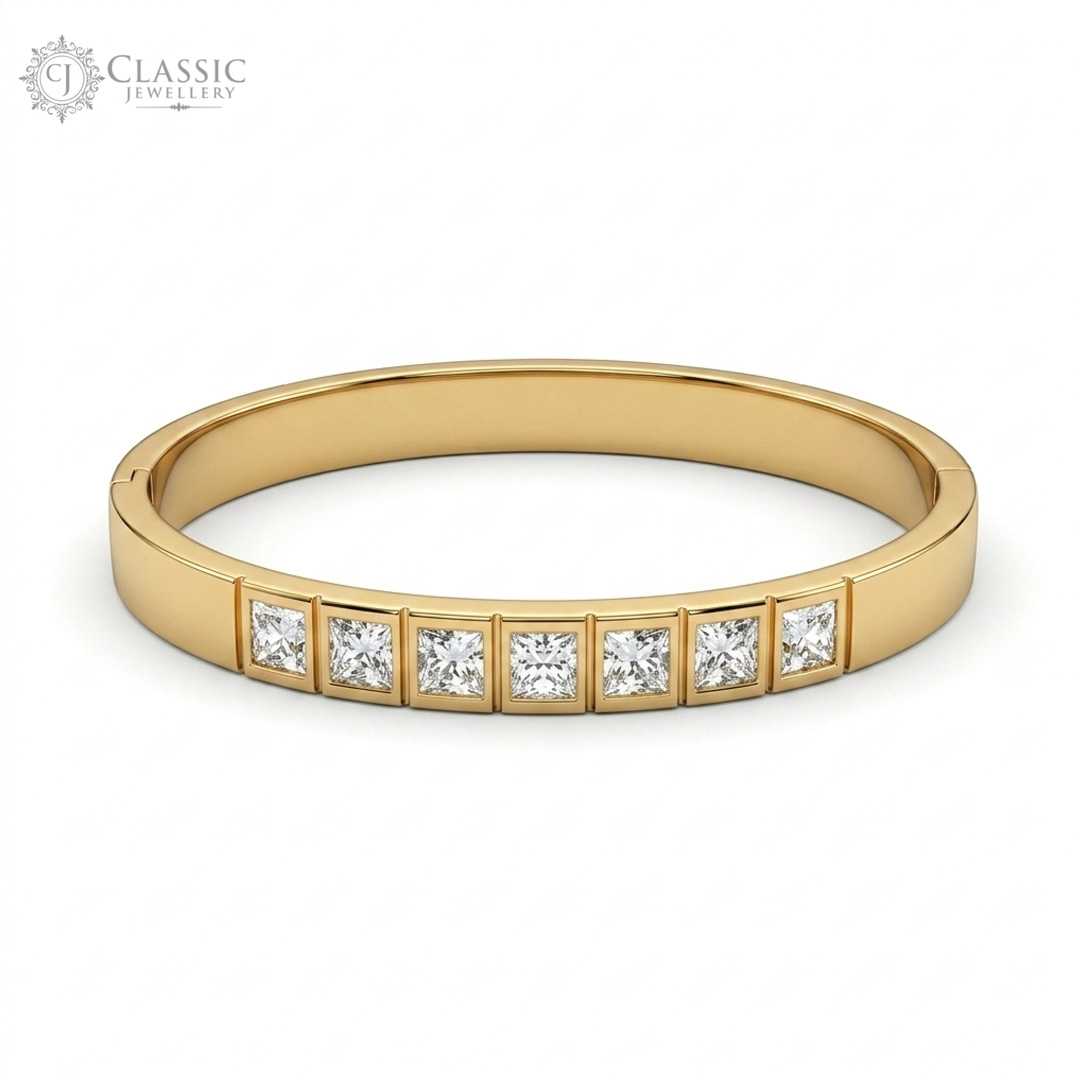 Sophisticated Luxury Redefined:This striking piece features a linear arrangement of seven perfectly square-cut crystals, seamlessly channel-set to create a continuous, brilliant band. The high-polish gold setting offers a luxurious warmth, while the sleek, minimalist design makes it an excellent choice for stacking or wearing as a single, commanding statement piece.