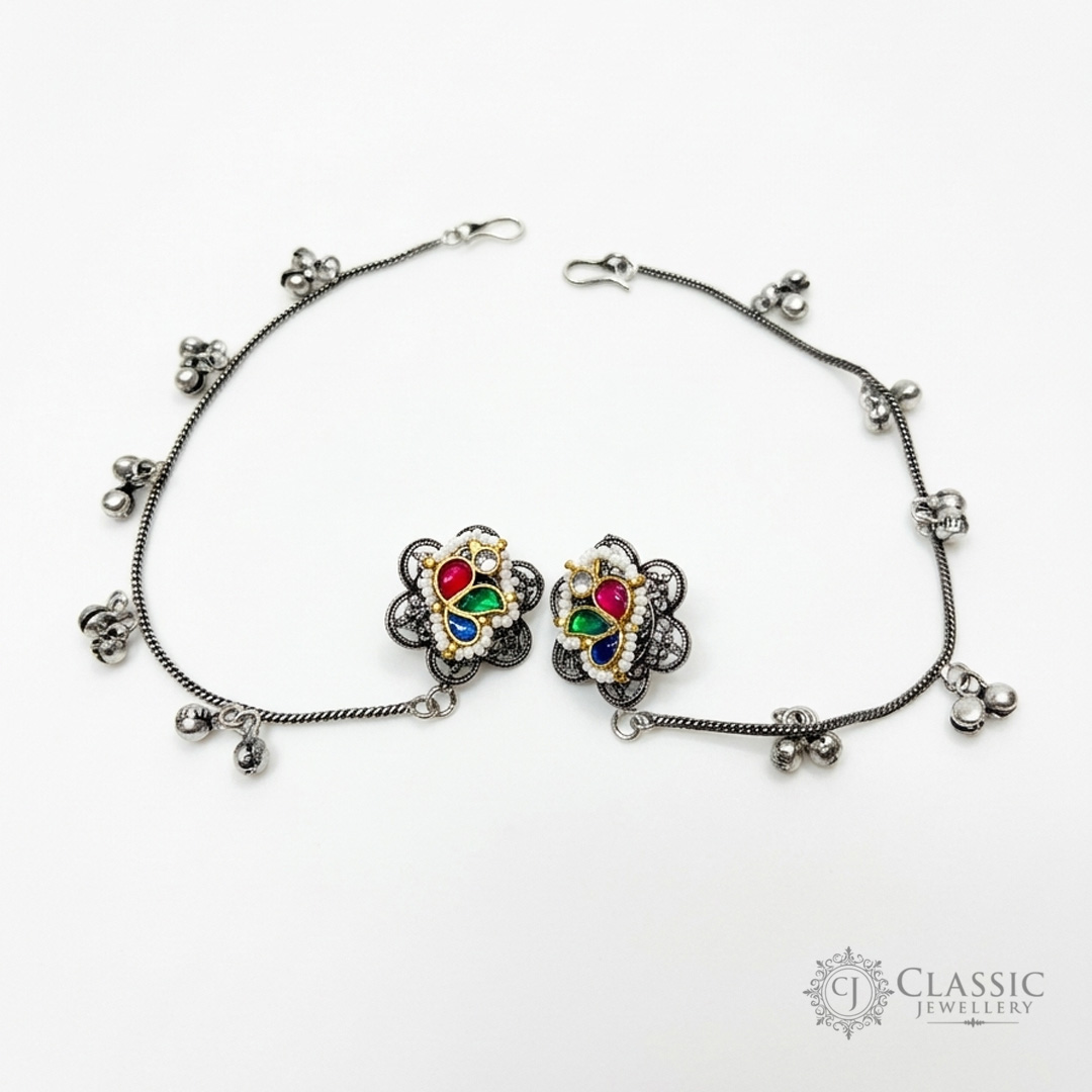 Traditional Regal Charm Make a statement with our Floral Sahara Earrings. Featuring an German silver flower stud adorned with vibrant multi-color stones and pearls, this piece is elevated by a stunning “Sahara” hair chain finished with rhythmic ghungroo bells.