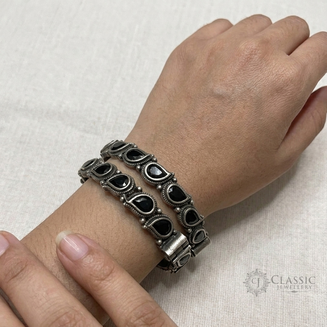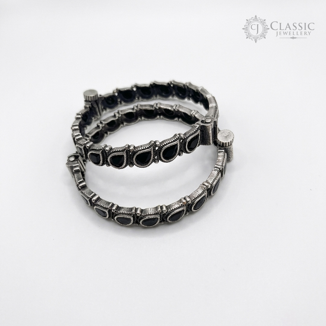 Vintage Boldness Add a touch of ethnic drama to your look with our Antique Black Stone Kadas. Featuring a beautiful German silver finish and deep black teardrop stones, these bangles are designed for those who love traditional craftsmanship with a bold edge.