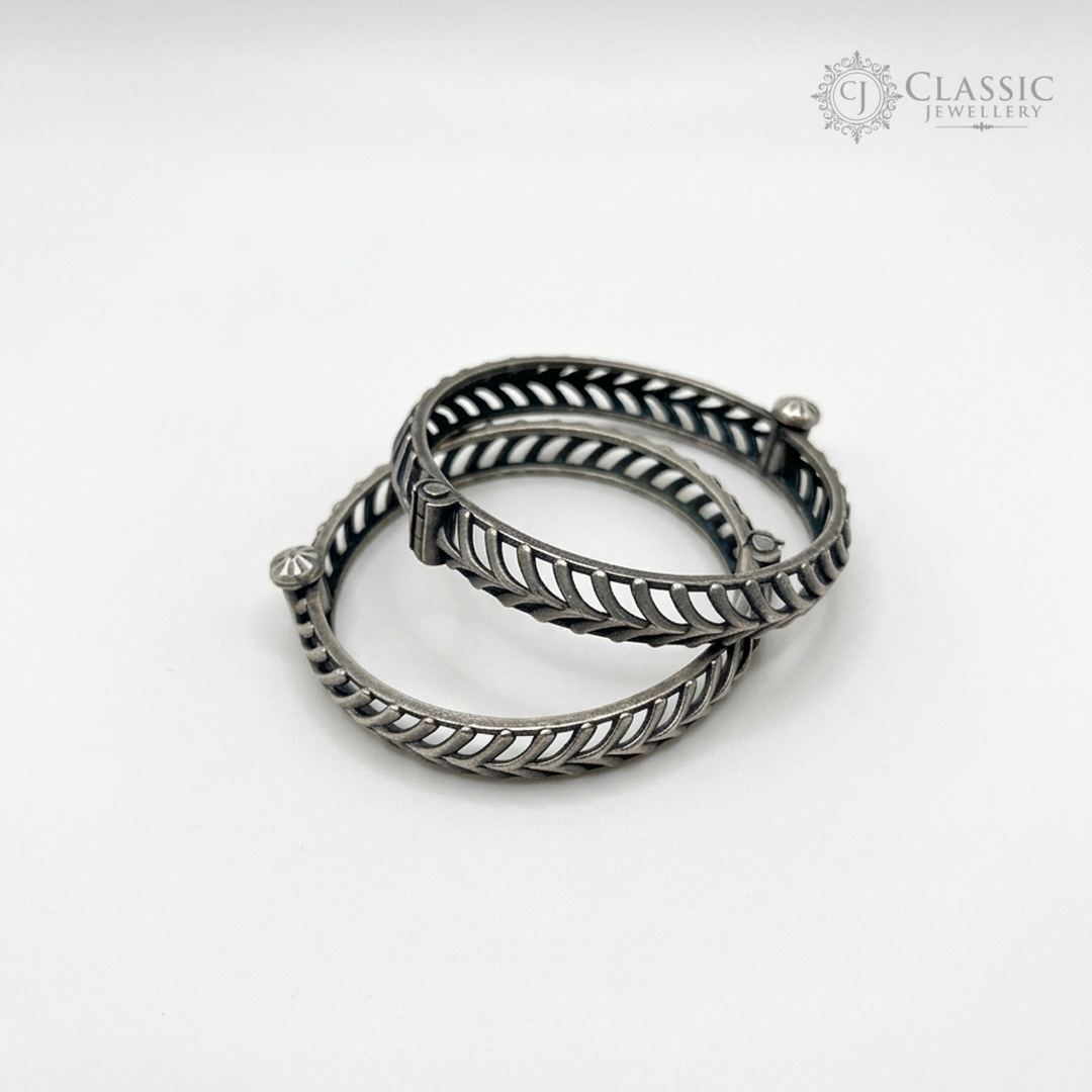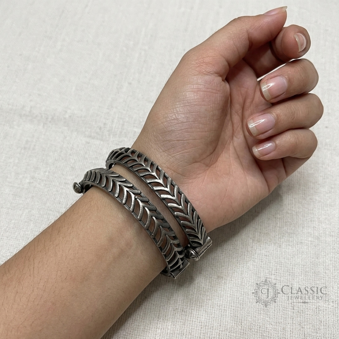 Handcrafted with intricate chevron patterns, this pair of German silver bangle kadas adds a touch of traditional elegance to any outfit.