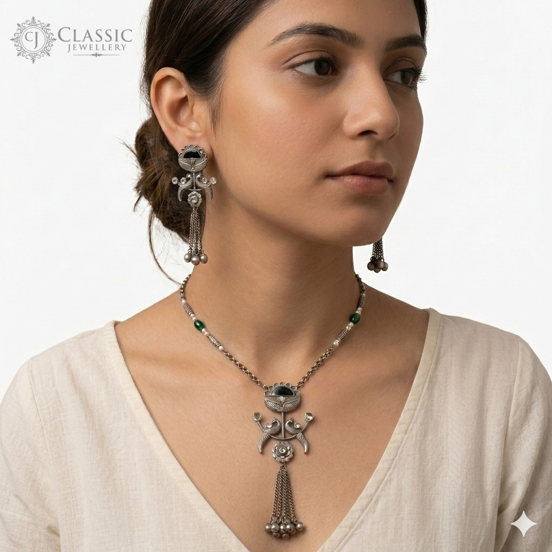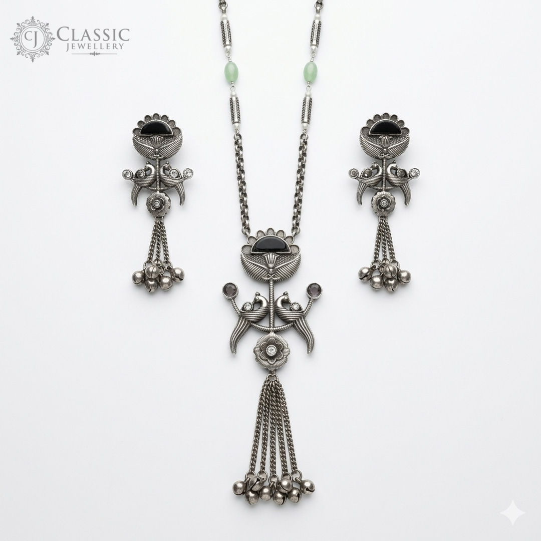 Embrace vintage charm with this handcrafted oxidized jewelry set. Featuring intricate peacock motifs, black stone accents, and playful ghungroo tassels, this set is the perfect statement piece for ethnic wear and festive celebrations.