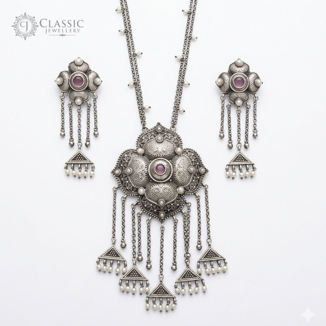 Embrace bohemian elegance with this stunning artisan jewellery set. Crafted from high-quality German silver-tone metal, the set features a large, elaborate tribal-style pendant and matching statement earrings. Each piece is meticulously detailed with filigree work and central purple-colored cabochon stones. Dramatic, cascading chains ending in triangular dangles and small white seed pearls add movement and vintage charm to this exquisite handcrafted set.