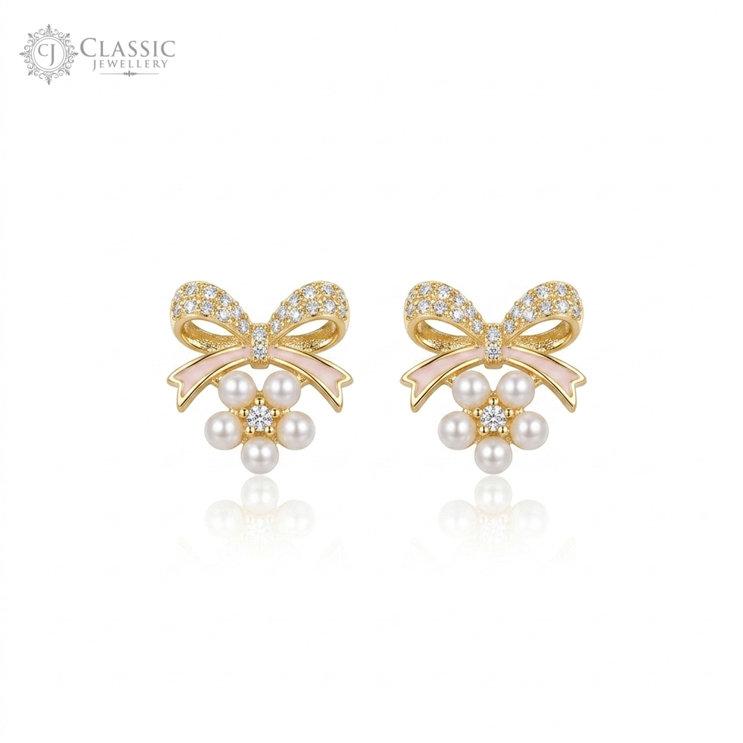 Charming & Playful Elegance Celebrate your feminine side with our Golden Bow & Pearl Studs. Featuring a delicate crystal-studded bow paired with a dainty pearl flower, these earrings bring a touch of whimsical luxury to your jewelry box.