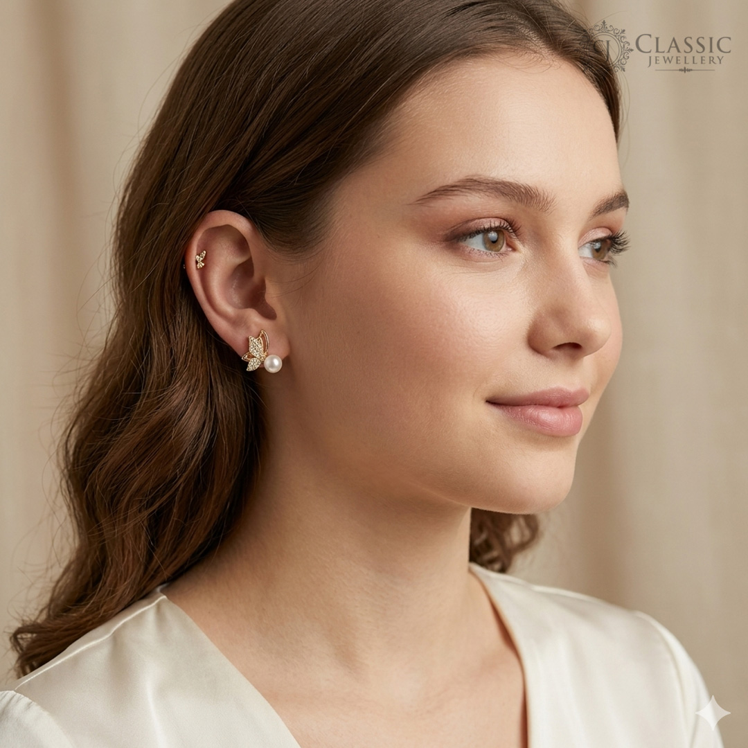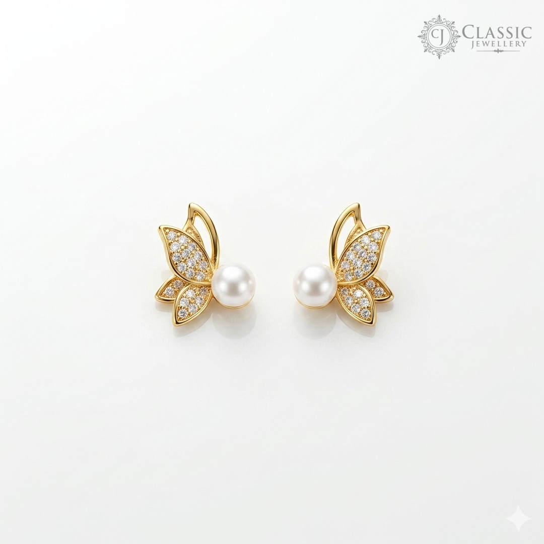 Graceful Flutter into elegance with our Butterfly Pearl Studs. Featuring intricate crystal-studded wings and a lustrous center pearl, these gold-plated earrings offer a delicate yet luxurious touch to any outfit.