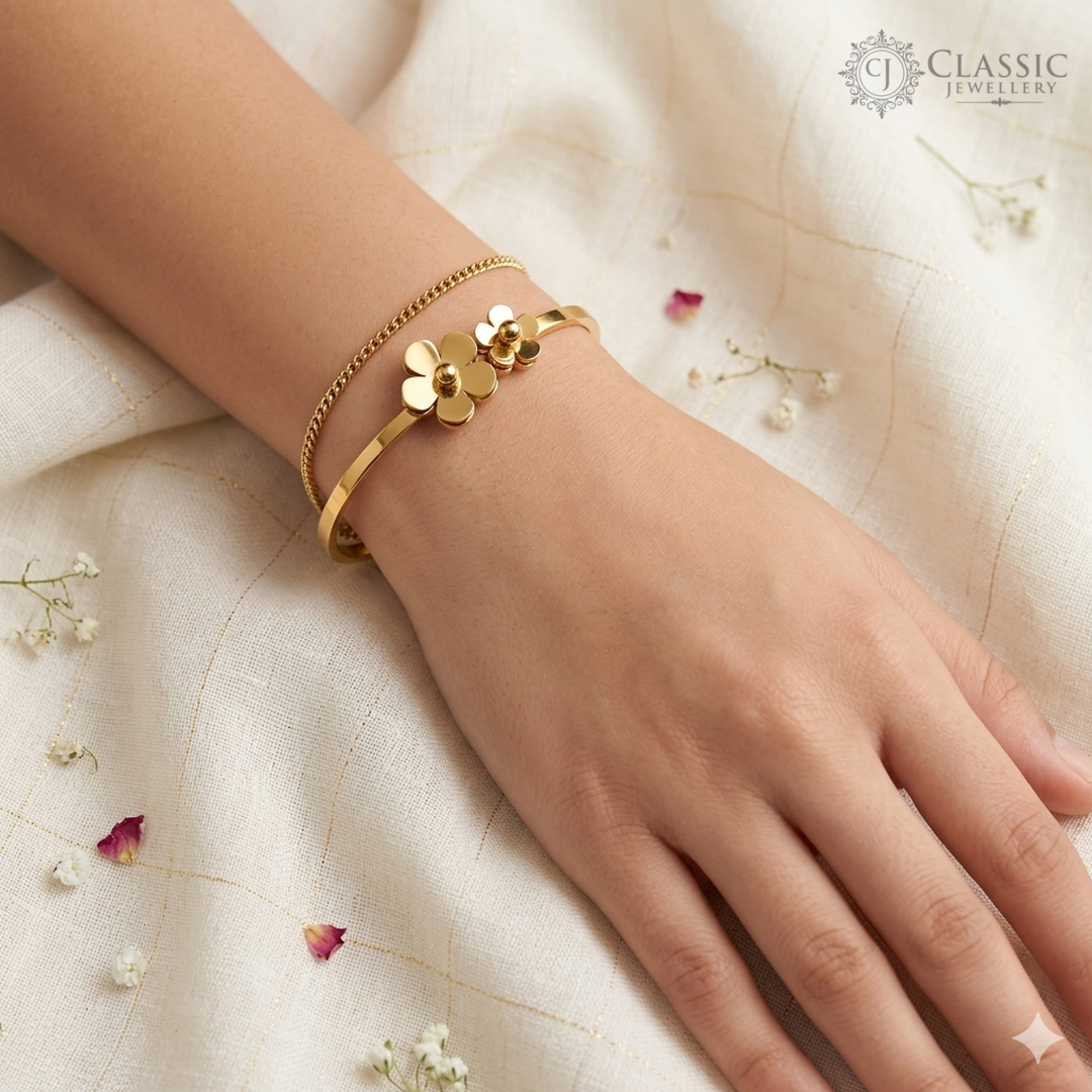 Add a touch of nature-inspired beauty to your wrist with our Double Flower kada. Featuring two polished golden blossoms on a sleek, high-shine band, this piece offers a perfect balance of modern minimalism and feminine charm.