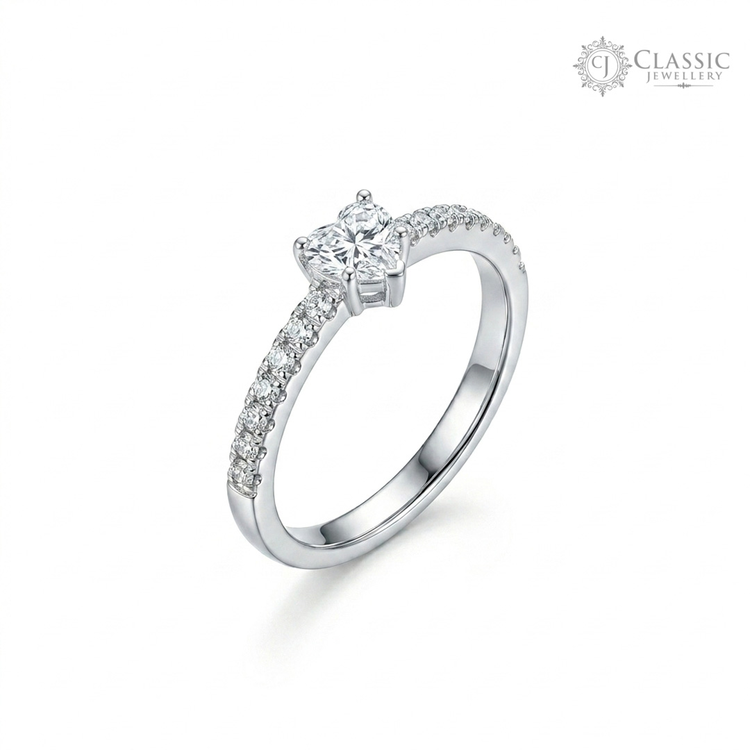 Romantic & Radiant Show your love with our Heart Solitaire Ring. This delicate piece features a heart-cut center stone and a sparkling band, making it the perfect promise ring.