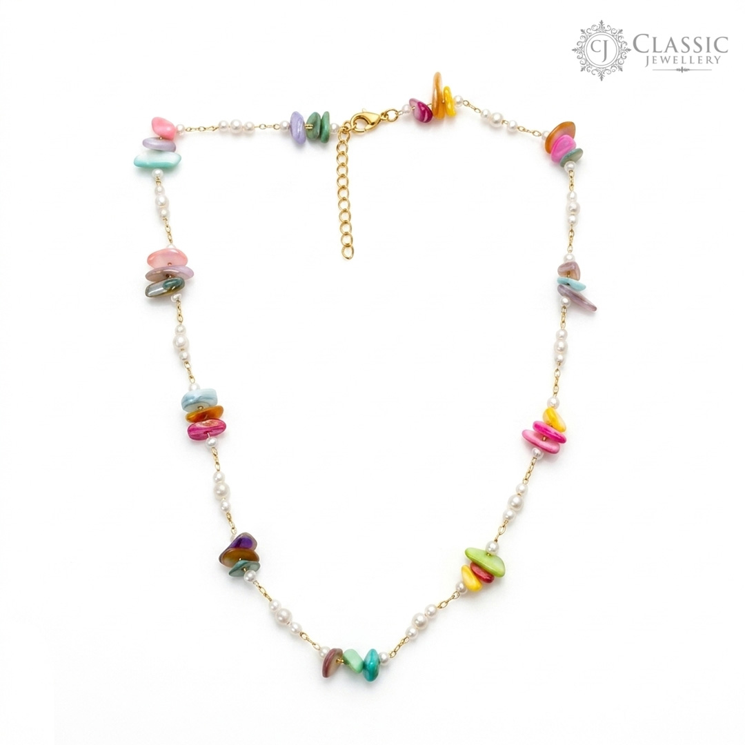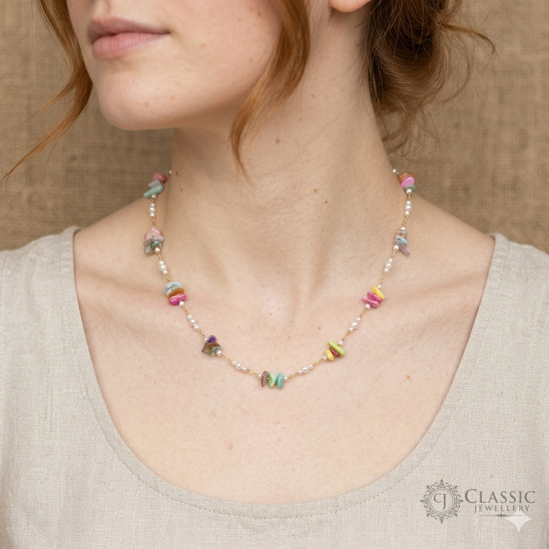 stones: Alternating multi-colored stone chips (varied shapes/types) and small white freshwater seed pearls
