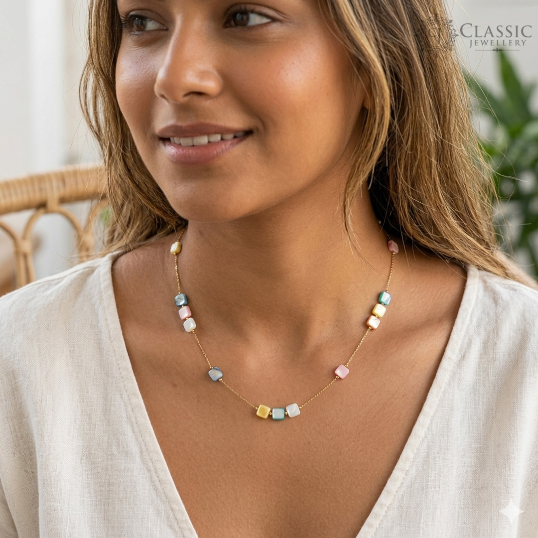 Elevate your everyday elegance with our Multi-Color Square Bead Necklace. Designed for the modern woman who loves a blend of minimalism and vibrant style, this piece features high-quality square beads set on a dainty golden chain. Whether you’re heading to a brunch or a formal meeting, this necklace adds a sophisticated pop of color to any outfit.