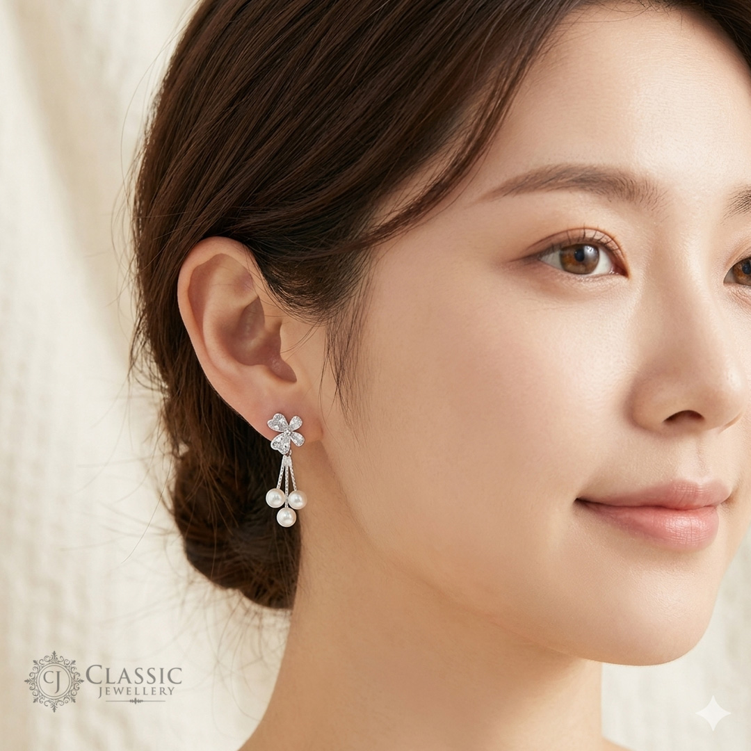 Add a touch of refined elegance to your look with our Clover Pearl Dangles. Featuring a sparkling four-leaf clover stud and a unique triple-pearl drop, these silver-toned earrings are the perfect blend of luck and luxury.