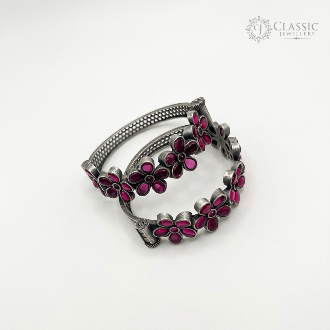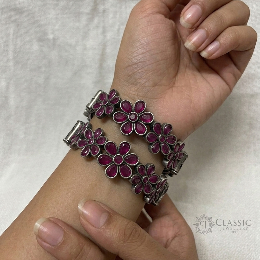 A charming pair of antique-finish bangles adorned with vibrant, Pink floral stones. Perfect for adding a joyful pop of color to ethnic or fusion outfits.
