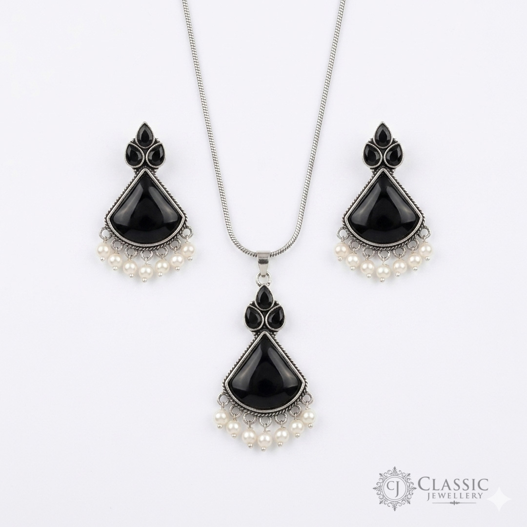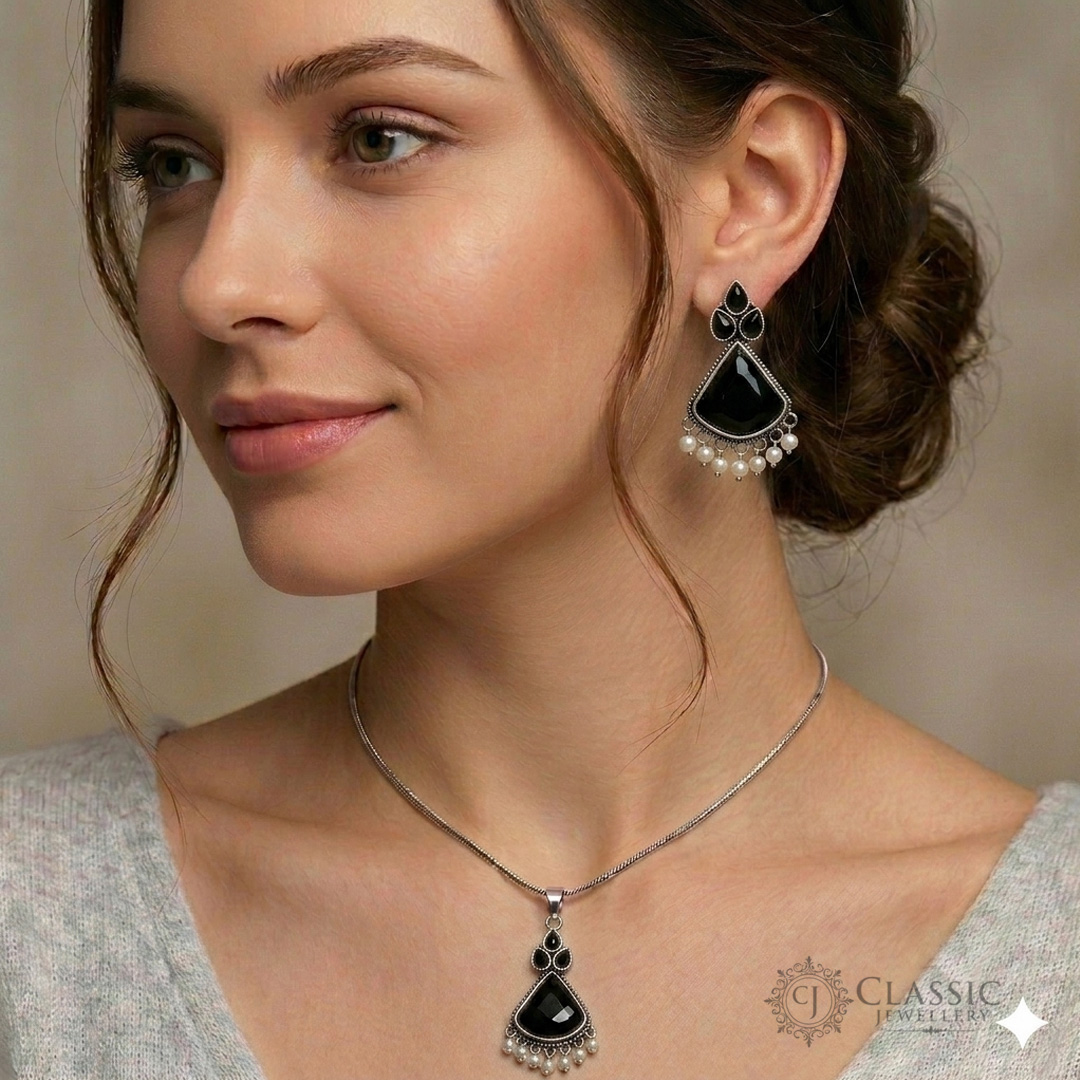 Elegant Ethnic Grace Add a touch of vintage charm to your collection with our Black Stone Necklace Set. This beautifully handcrafted set features soft pink teardrop stones set in an antique silver finish, accented with delicate white pearls for a classic look.