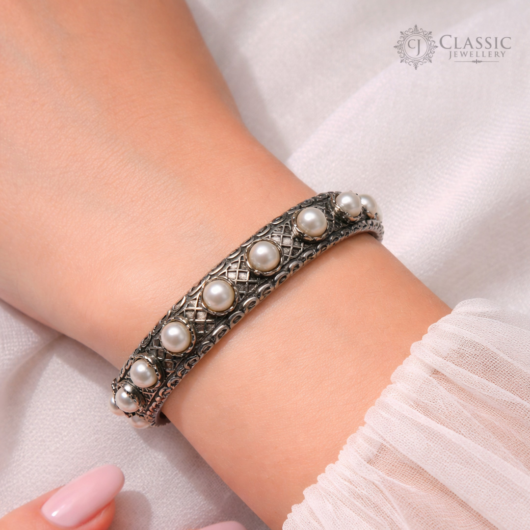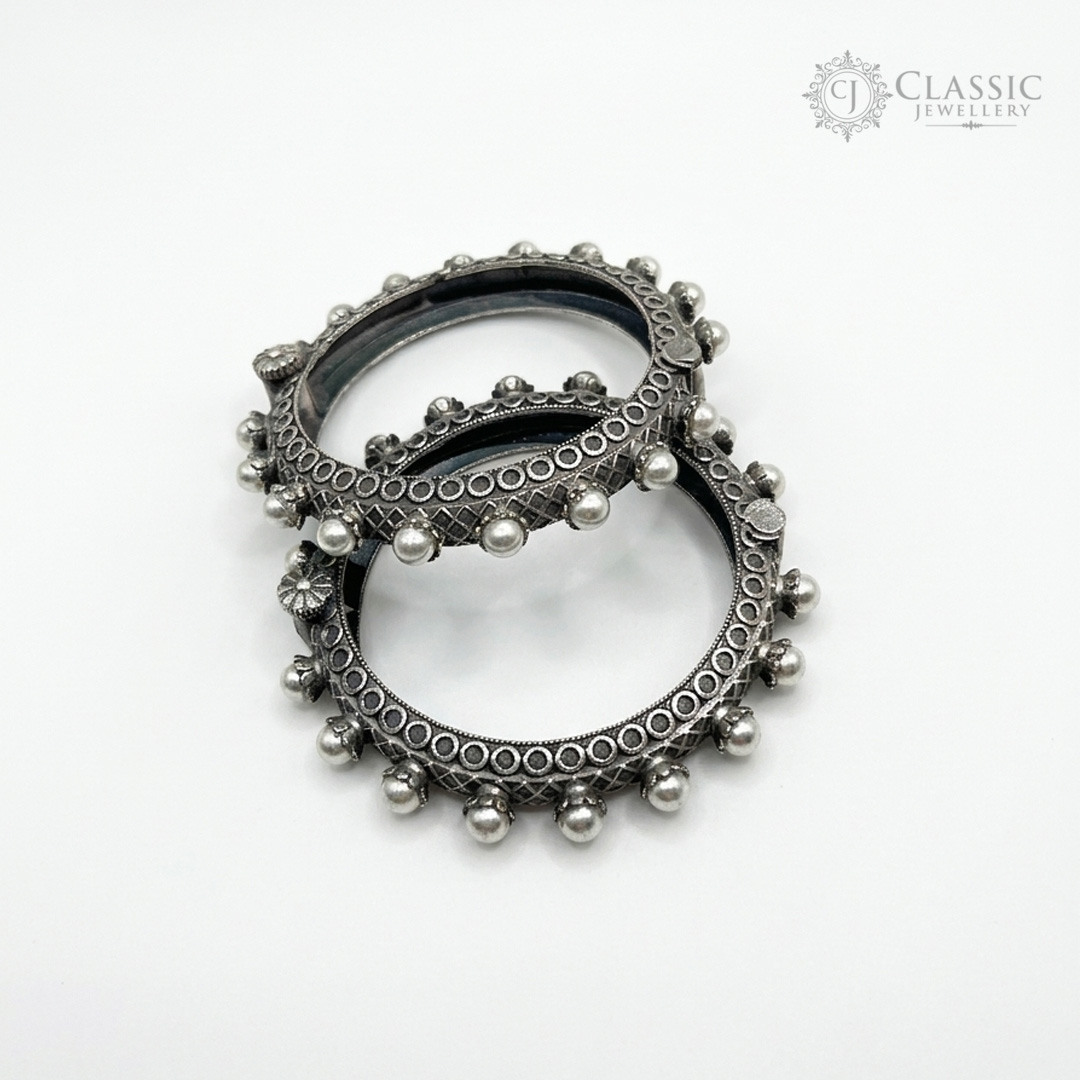 Elegant handcrafted German silver bangle set featuring ornate traditional patterns and delicate pearl bead drop accents, offering a vintage, ethnic look.